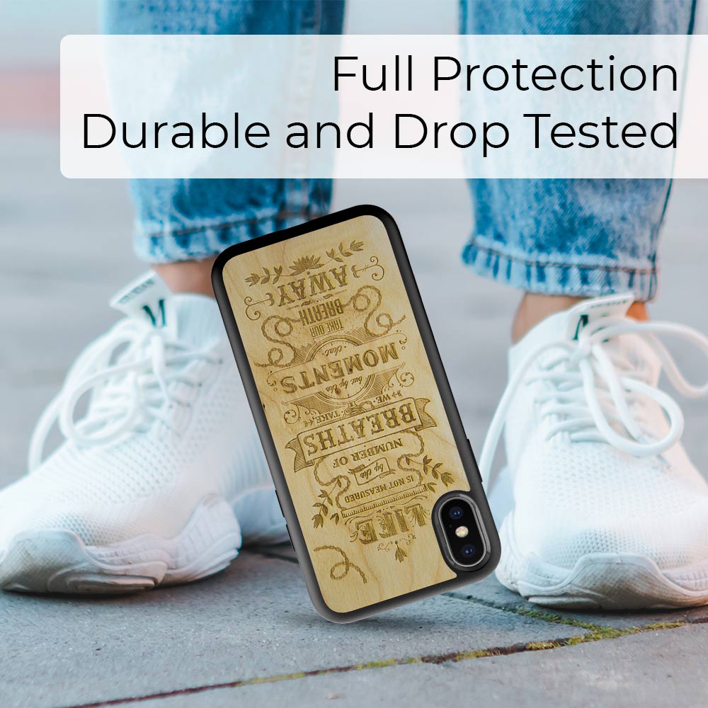 If you want a fine and unique wooden phone case, you found it. The Engraved the Meaning phone case is oiled and finished by hand, made from the best and most exquisite wood. Each phone case is also unique because two pieces of wood are never the same and that’s why the carving can be slightly different. The wooden case is warm and pleasant to the touch, very thin, and rubber-coated to prevent slipping.