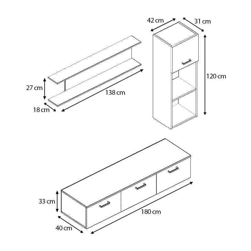 • The composition consists of a TV stand, a shelving unit and a wall cabinet.